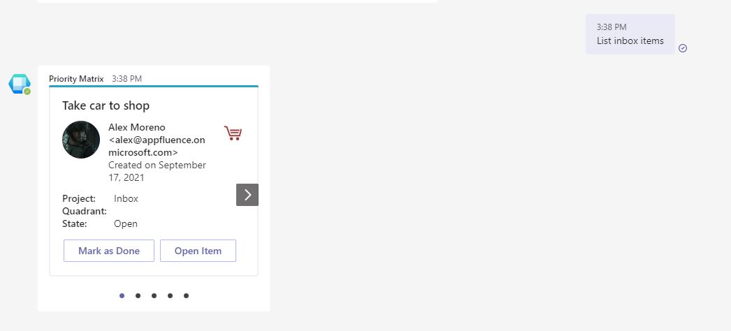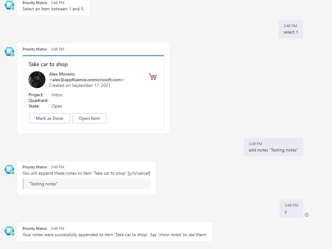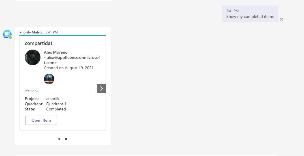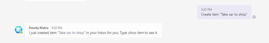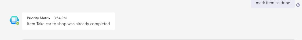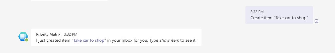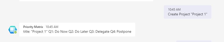 Priority Matrix for Teams offers a smart chatbot that lets you work with your Priority Matrix data almost as if you were talking to a friend. You can update the status of your items with simple commands, and keep your entire team on the same page. Try the commands below on Microsoft Teams, and see how it works out for you: