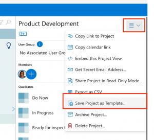 - Save project as a template via the project-details menu, in the top-right corner of the screen