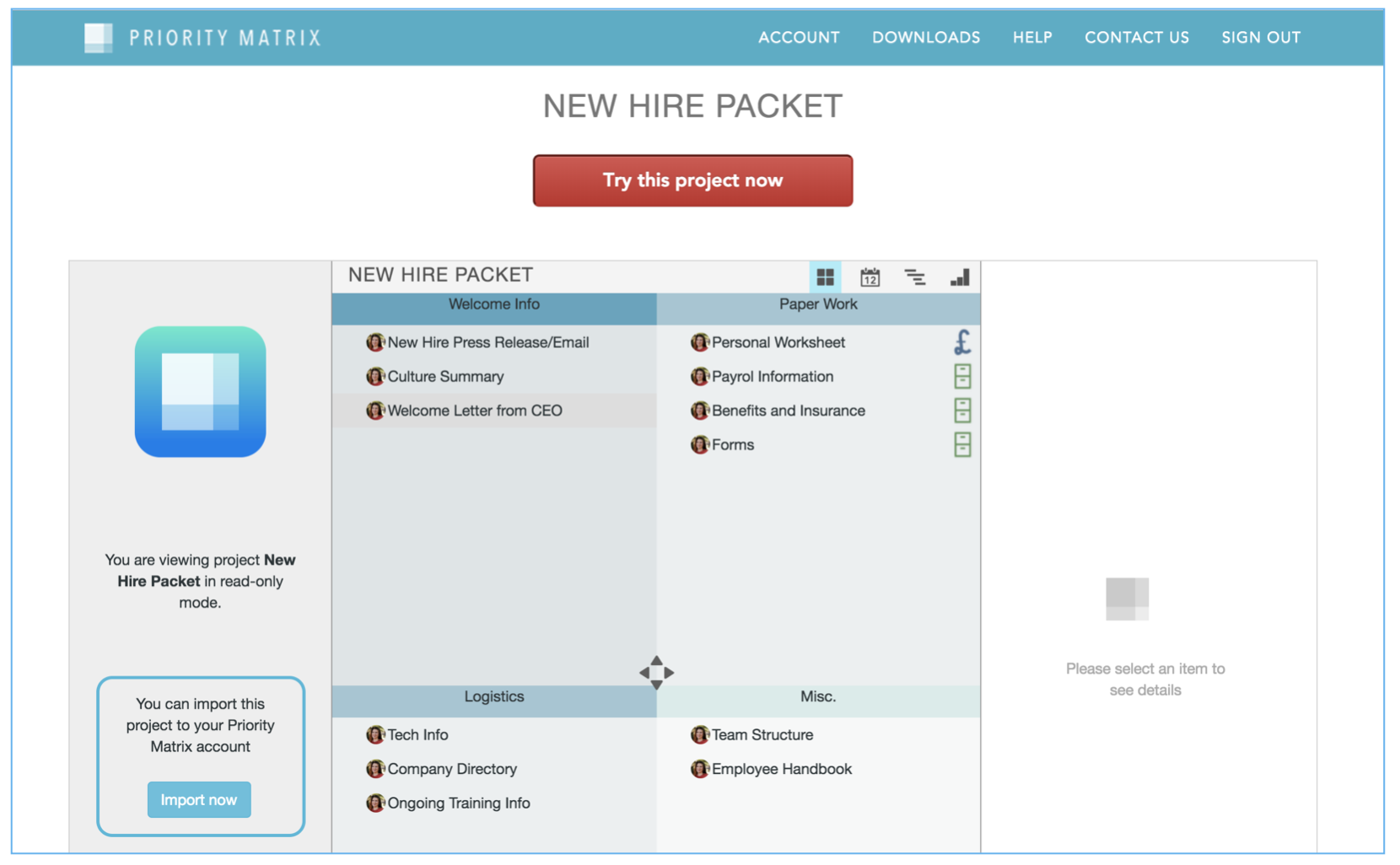 In priority matrix, HR professionals can create a new hire packet template with all the generic items that it is policy to include. When on-boarding a new hire, they can easily add important forms to the Priority Matrix new hire packet and share it with the new employee. While physical welcome items will be waiting for the new employee on their desk, the critical documents in the new hire packet will be safely stored in Priority Matrix. This way, HR managers can have the peace of mind that all the important forms will be kept track of. We have created a public New Hire Packet Template for you to launch. This template is divided into four categories:- Welcome Info- This will hold the press release or new hire email that may have been sent to the company. Any official announcement so that the new hire is aware of it. In addition, the welcome letter from the CEO can be placed here. Finally, any additional welcome info, like an overview of company culture, etc.