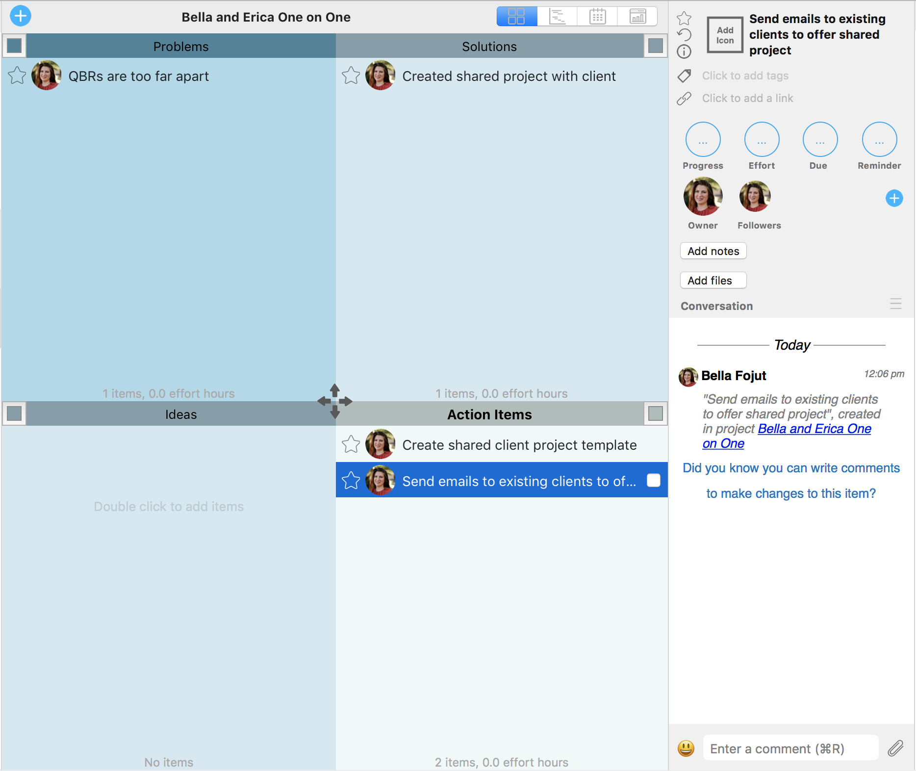 In addition, the both of you can easily create action items in a shared project during the meeting to make sure that you both follow up on the great ideas that emerge: